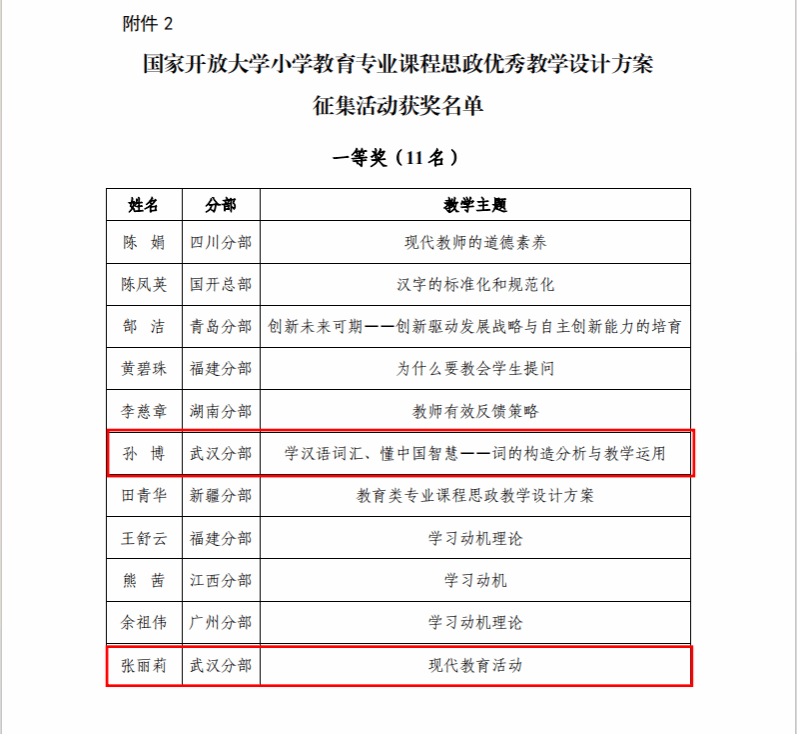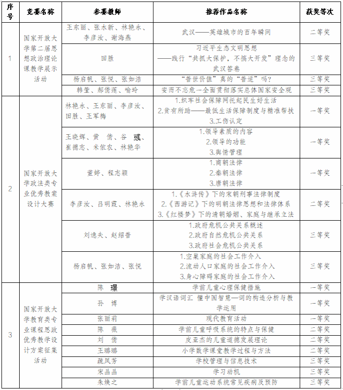国家开放大学2023年课程思政竞赛武汉分部获奖名单