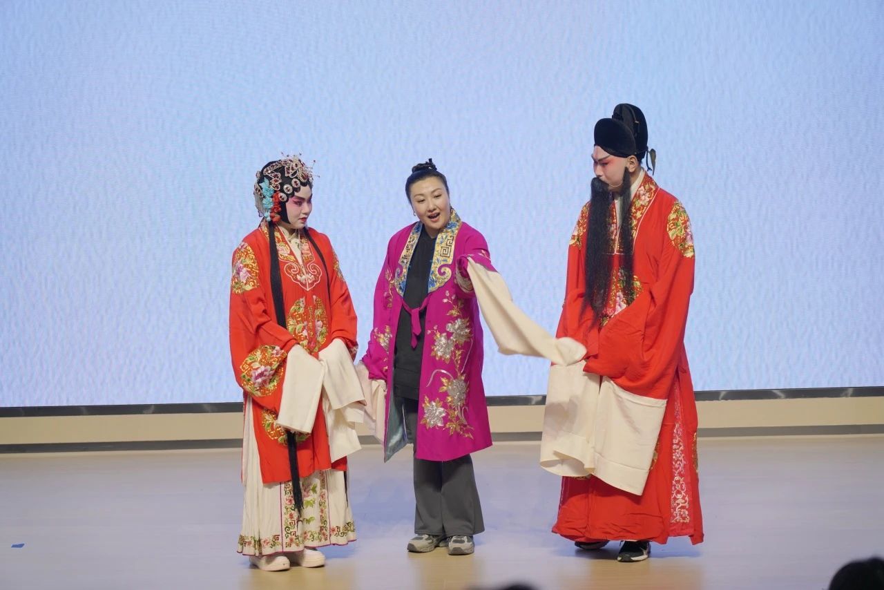 两位同学应邀上台,画上戏装,穿上戏服,舞动水袖,跟随王荔老师,从手势、动作、身形、表演各方面进行了沉浸式体验。台上精彩纷呈,台下兴致盎然,一次又一次热烈的掌声表达了师生对艺术家的敬意和对中华优秀传统文化的热爱。