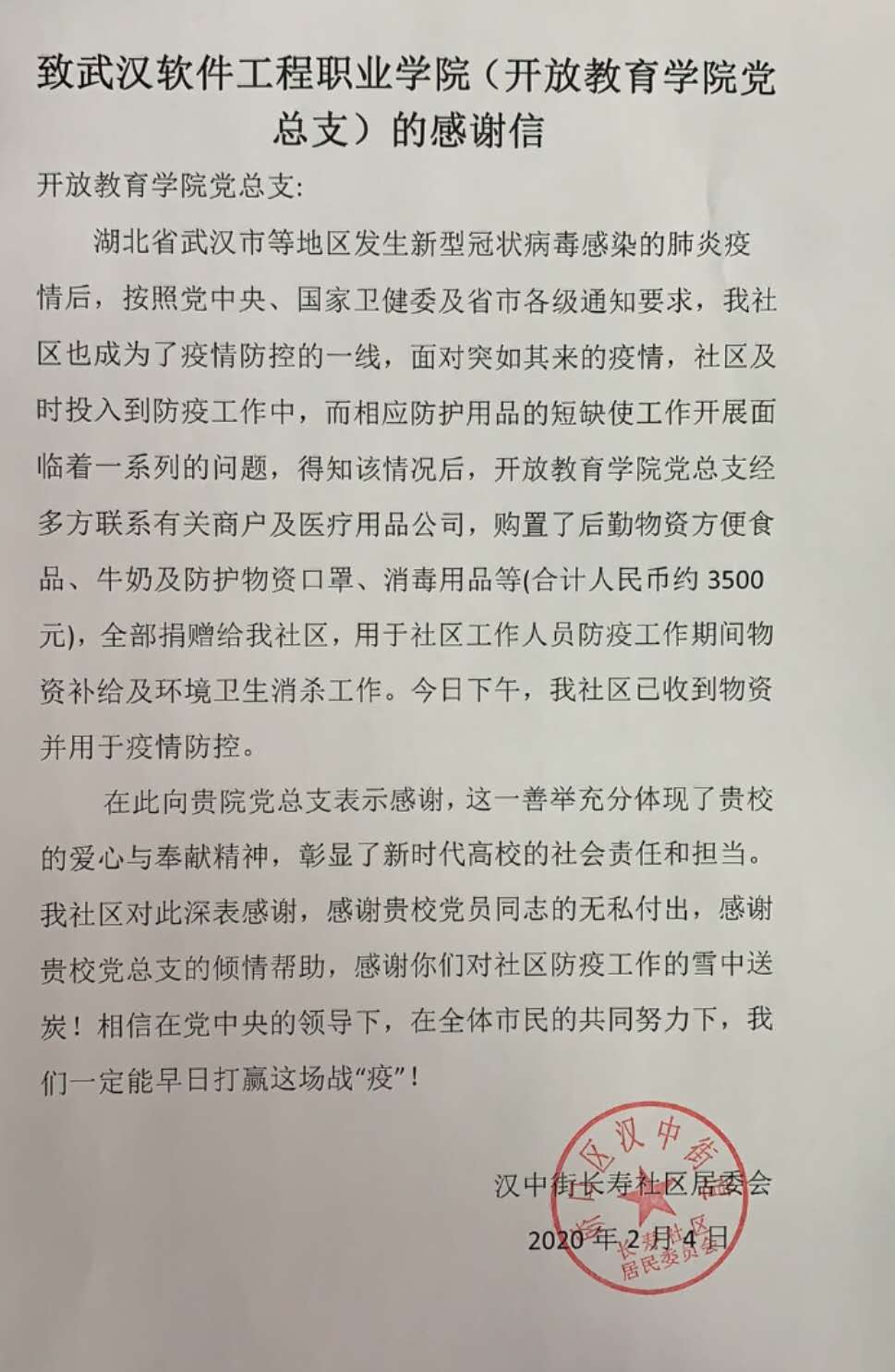 2月4日上午,正是立春节气,汉中街长寿社区的工作人员在严寒中感受到了一些春天般的温暖。这一天,辖区内的开放教育学院为支援长寿社区的疫情防控工作,为连续疲劳作战的他们送来了50包口罩、20瓶84消毒液、20箱牛奶、20箱方便面等防控物资。“我院尽微薄之力向社区送去应急紧缺物资,为疫情防控尽一份力,相信在大家的共同努力下,疫情一定会得到控制。”学院党总支书记赵文锋说。在疫情急如星火的时刻,雪中送炭般的帮助让这对文明共建兄弟单位的情谊历久弥坚。