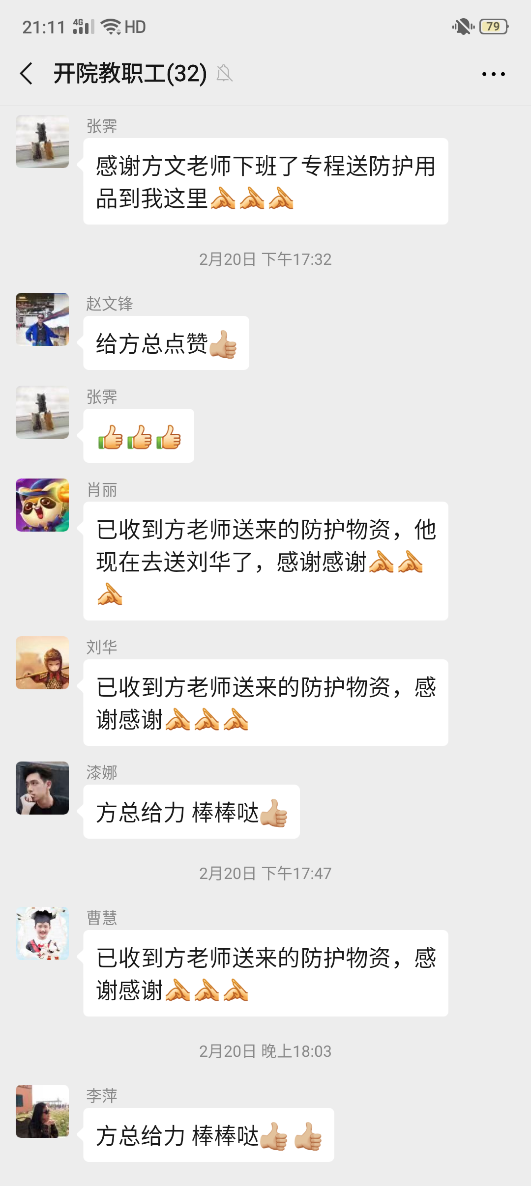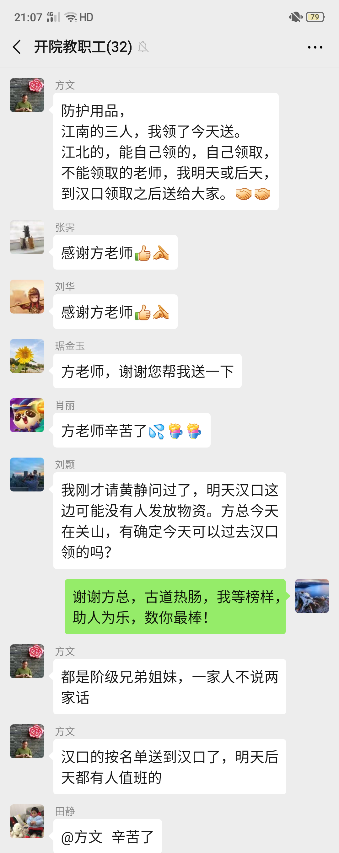 在同事的眼中,他是一个古道热肠的人,疫情期间,很多人由于交通原因,无法领取防疫物资,但是没有物资保障,下沉社区无疑把大家置身危险境地。于是,他就经常从关山校区驱车四五十公里,几乎纵贯了整个武汉市,把东西一一交到同事们手中。据悉,方文从2月11日作为捐赠接收联系人以来,到发稿时止,已经连续工作了26天,中间只休息了一天,成为开院抗击新冠病毒的最坚定的“逆行者”。