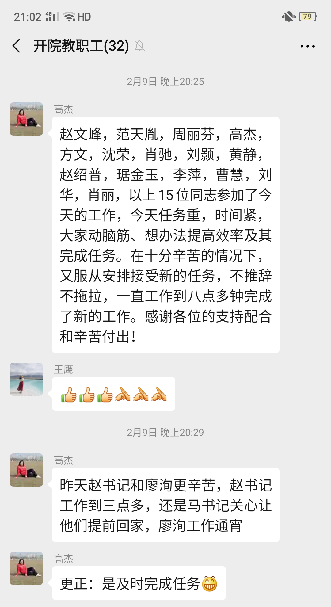 2月7日接到学校紧急通知“请所有在汉身体健康的职工立即赶往关山校区”时,大家即从武汉各个地方克服各种困难赶往学校,“饿着肚子工作到接近晚上9点,干的是脏活累活”,2月8日晚,赵文锋书记工作到第二天凌晨3点多,廖洵老师更是通宵加班,没有一个人叫苦喊累。