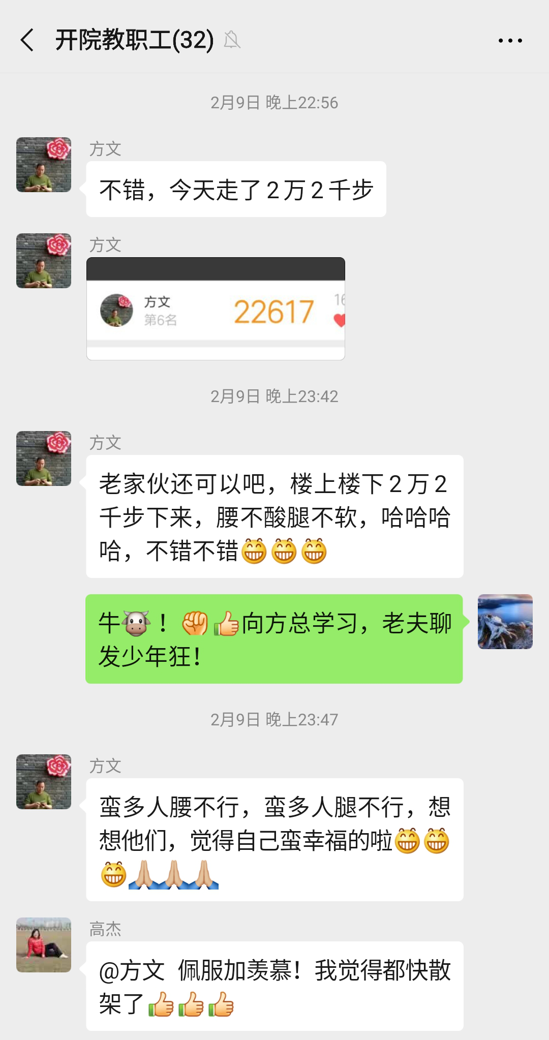2月9日,是学校被辟为方舱医院后开院老师去清理宿舍的第三天。晚上接近11点了,方文老师在开院教职工群中晒了一张“微信运动”图片,上面赫然显示“22617”,这是当天他走的步数,这个同事嘴中亲切的“方总”,已经是一个年近六旬的“老头儿”,他还不无得意地说“老家伙还可以吧,楼上楼下2万2千步下来,腰不酸腿不软”,话里透出一股不输给年轻人的劲儿。