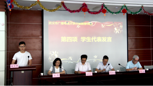 开放教育学院副院长凃明星宣读了国家开放大学奖学金、2018年度国家开放大学优秀毕业生、武汉电大学奖学金、“网上学习三星”、武汉电大第十届创业大赛获奖学生表彰名单。