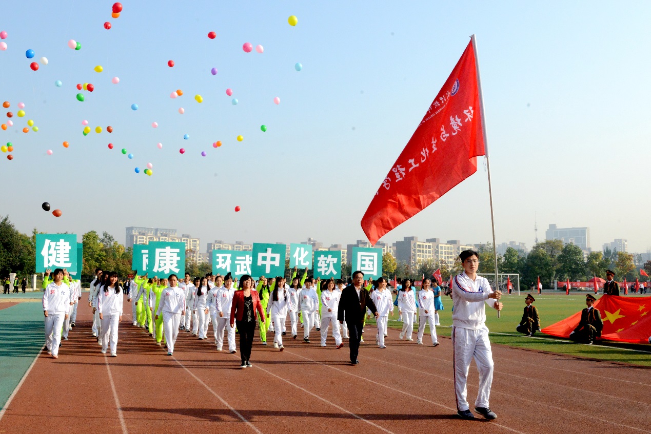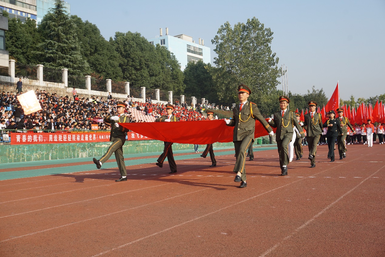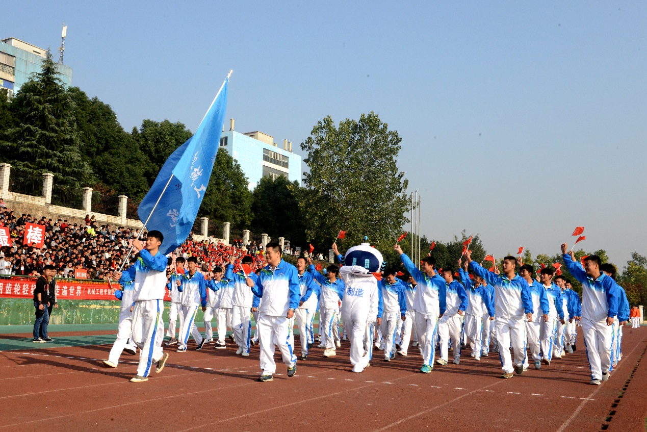 8点30分,伴随着嘹亮的《运动员进行曲》,英姿飒爽的护旗队大步向前,鲜艳夺目的红旗方队紧随其后。各具特色的鲜花队、志愿者队、各学院代表队、教职工代表队、裁判员代表队伍依次入场。各方队服装整齐,神采奕奕,以别具匠心的方式展现我校师生的风采。计算机学院 “纯爷们儿”方队口号震天,机械工程学院方队派出“机器人”,电子工程学院方队举起点赞牌,汽车工程学院方队亮出朵朵向日葵,环化学院方队举起“美丽中国”牌,商学院方队摆出“五朵金花”造型,艺术与传媒学院方队挥手展示别致的彩色手套,体育学院方队挺拔矫健,吸睛无数。多个方队放飞彩色气球,将场上的欢呼引上云霄。