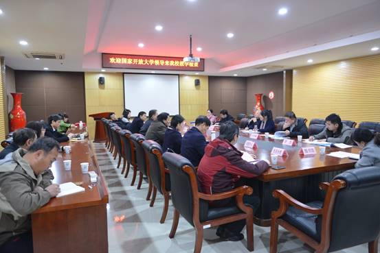 11月29日上午,国家开放大学质量检查特聘专家刘承邠,国家开放大学质量监控与评价中心主任韩仪等一行六人来校对电大进行教学检查。我校党委书记胡大平、校长马蜂、副校长王路群及相关部门负责人参加教学检查会议。