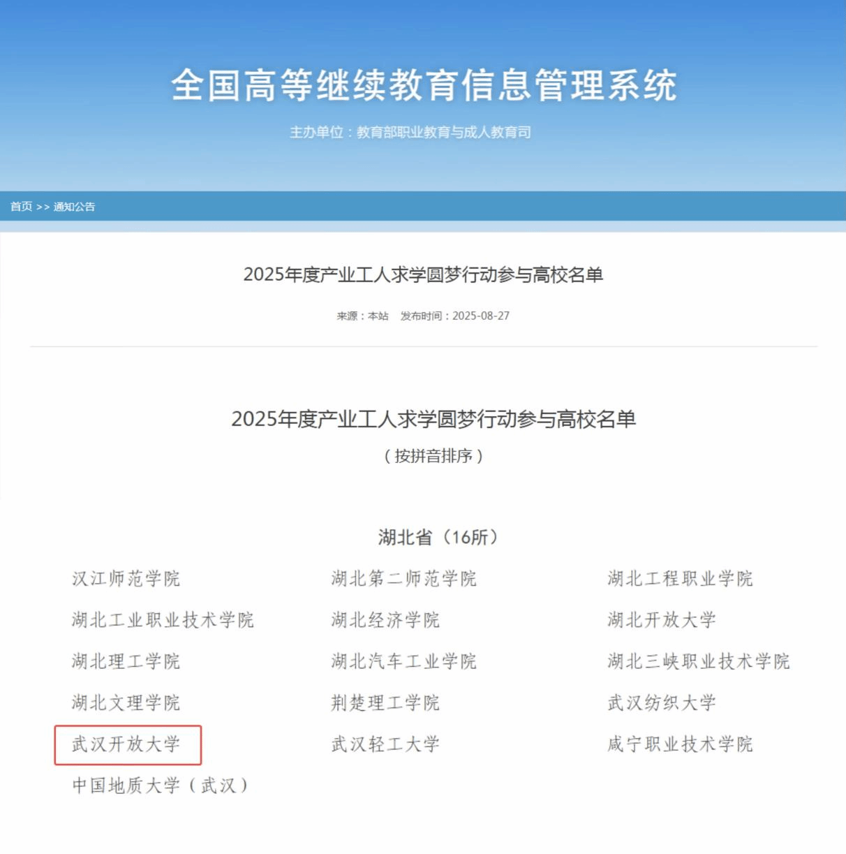 (通讯员 喻芷汀)近日,教育部正式公布2025年度产业工人“求学圆梦行动”参与高校名单,武汉开放大学成功入选!