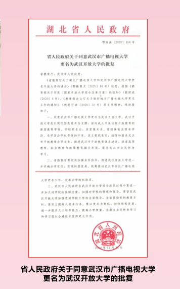 武汉开放大学(原武汉市广播电视大学)是武汉市人民政府主办的成人高校,是武汉地区承担国家开放大学开放教育的指定高校。2020年12月,湖北省人民政府同意武汉市广播电视大学正式更名为武汉开放大学(鄂政函〔2020〕156号)。2025年春季学期,武汉开放大学继续面向全市招生。