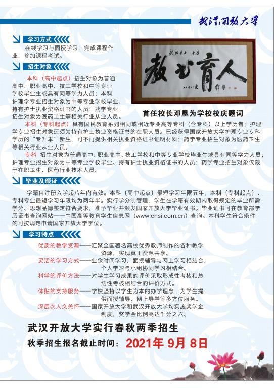 上一条:关于召开武汉开放大学2022年春季招生工作会议的通知 下一条:关于转发《国家开放大学开放教育教学过程管理规范(试行)》的通知