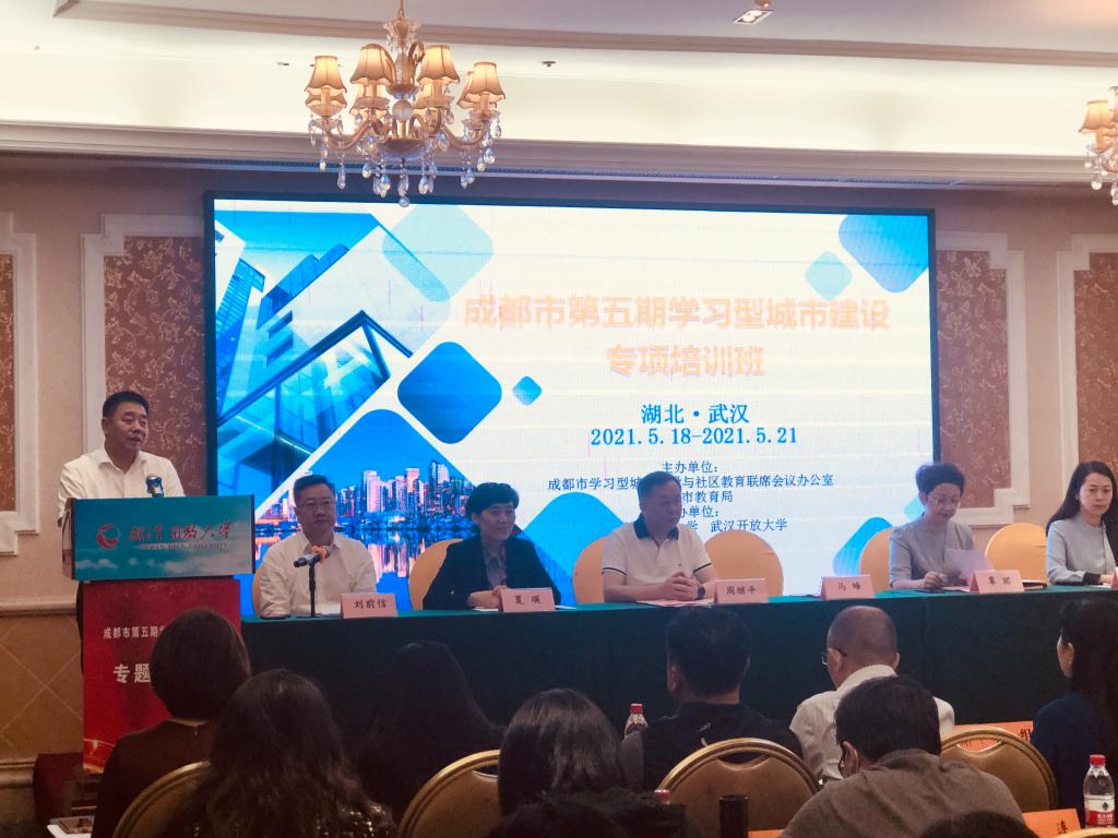 5月19日上午,由成都市学习型城市建设与社区教育联席会议办公室、成都市教育局主办,成都开放大学、武汉开放大学承办的成都市第五期学习型城市建设专题培训班举行开班仪式。成都开放大学党委书记周继平、中国成人教育协会社区教育专业委员会副理事、上海市成人教育协会副会长、上海市教育委员会终身教育处调研员夏瑛、成都市教育局终身教育与民办教育处二级调研员覃珺、成都开放大学副校长刁元园、我校党委书记马蜂、党委副书记、校长刘前信等领导出席仪式。仪式由刘前信校长主持。成都市学习型城市建设以及社区教育联席会议制度中22个成员单位的相关领导和区市县代表共54人参加本次培训。