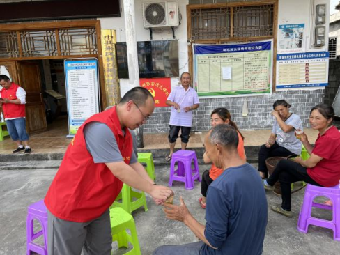 廖家坝村委会对面是片区小学——枫洞小学,小学和村委会中间是村民出行主干道248省道,每逢上下学时段,家长们都开着电动三轮车接送孩子,导致该路段经常拥堵不堪,也存在交通安全隐患。即将进入炎热的夏季,工作队为方便家长,在村委会入口处设置了一处“家长驿站”,驿站区备有爱心座椅、饮水机、书报架、备用雨具等,方便家长们在等候孩子们放学的时间休息聊天、读书看报。
