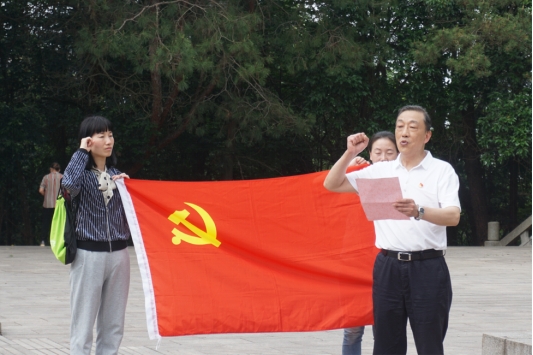 一路上,老同志们积极开展党史知识竞答,大家积极踊跃回答问题,重温党的发展史,并激情合唱《没有共产党就没有新中国》《我的祖国》等歌曲。12日下午,鄂豫边区革命烈士陵园内,老同志们在烈士纪念碑前列队,为革命烈士献花,缅怀先烈们的丰功伟绩。我校原党委副书记戴向军同志带领大家重温入党誓词,全体党员面向党旗,高举右拳,庄严起誓,重忆入党初心。